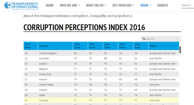 Con 71 puntos otorgados nuestro país ocupa el primer puesto a nivel latinoamericano y el 21° a nivel mundial entre los países con menor grado de corrupción. La información surge de un estudio recientemente presentado por la ONG Transparecia Internacional: el “Índice de Percepción de Corrupción 2016”.